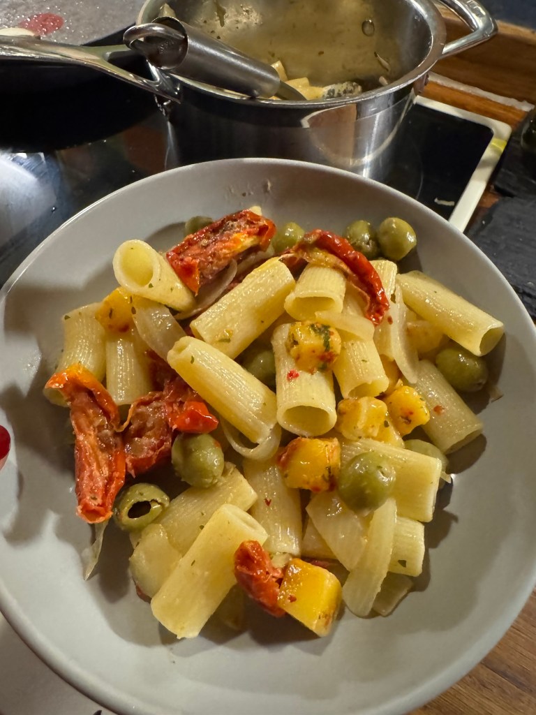 Rigatoni with sundried tomatoes, spicy cheese chunks, onion and olives!