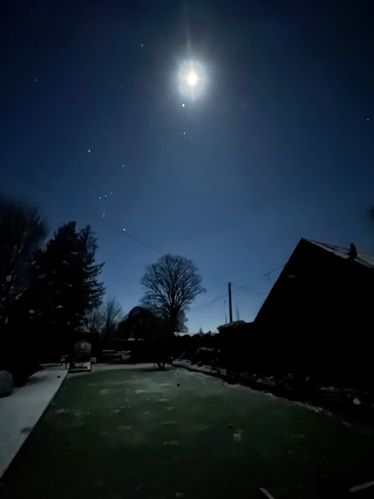 When I took the dogs out the back at 10.15pm, it was almost daylight. We didnāt need the floodlights on at all. It was so cold, so calm and so bright. it was lovely.