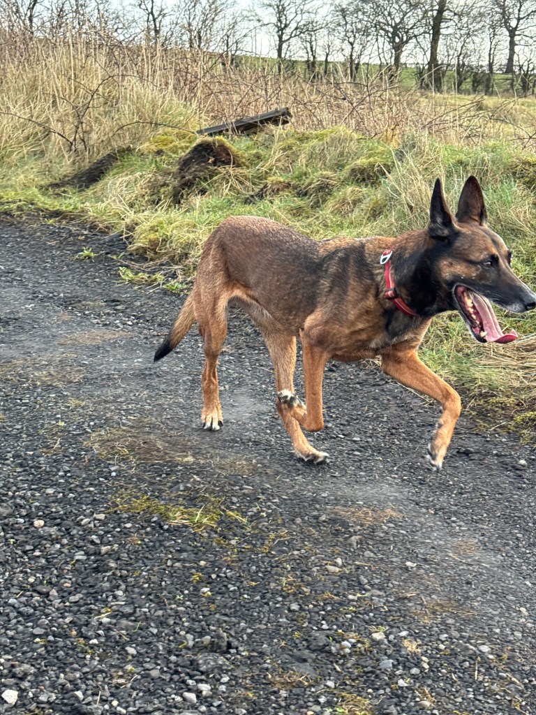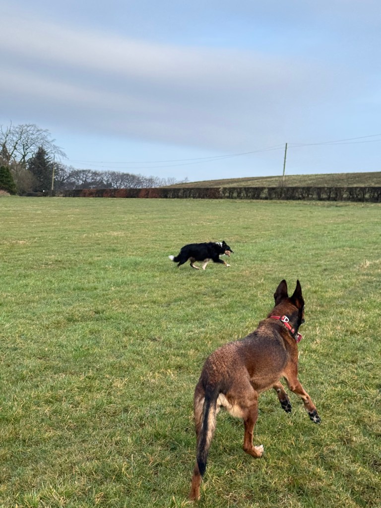 Calaidh is off lead, Khaleesi on. I love when I call Calaidh back, Khaleesi thinks I want her back š she only a couple of feet away, at the end of her lead but she comes bouncing back to me.