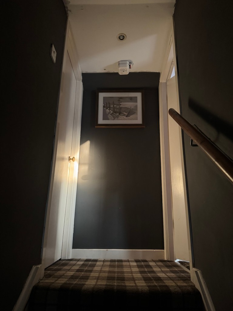 I get up to go to the loo at 7.30am, late for me, and the light at the top of our dark stairs, is really welcoming.