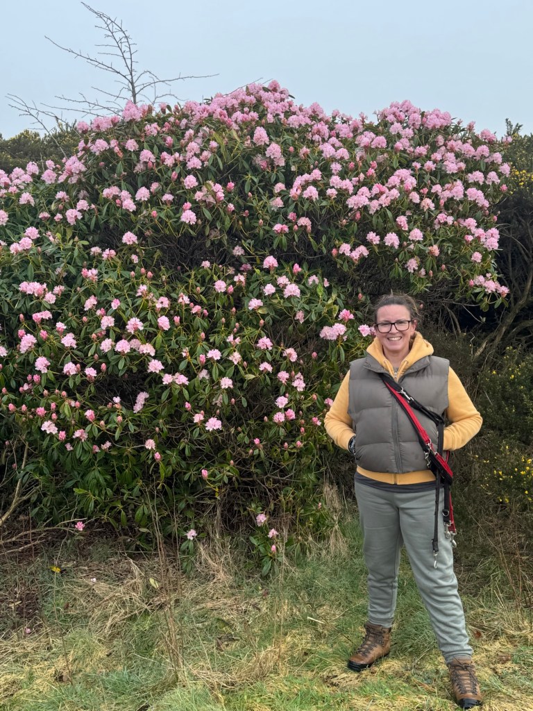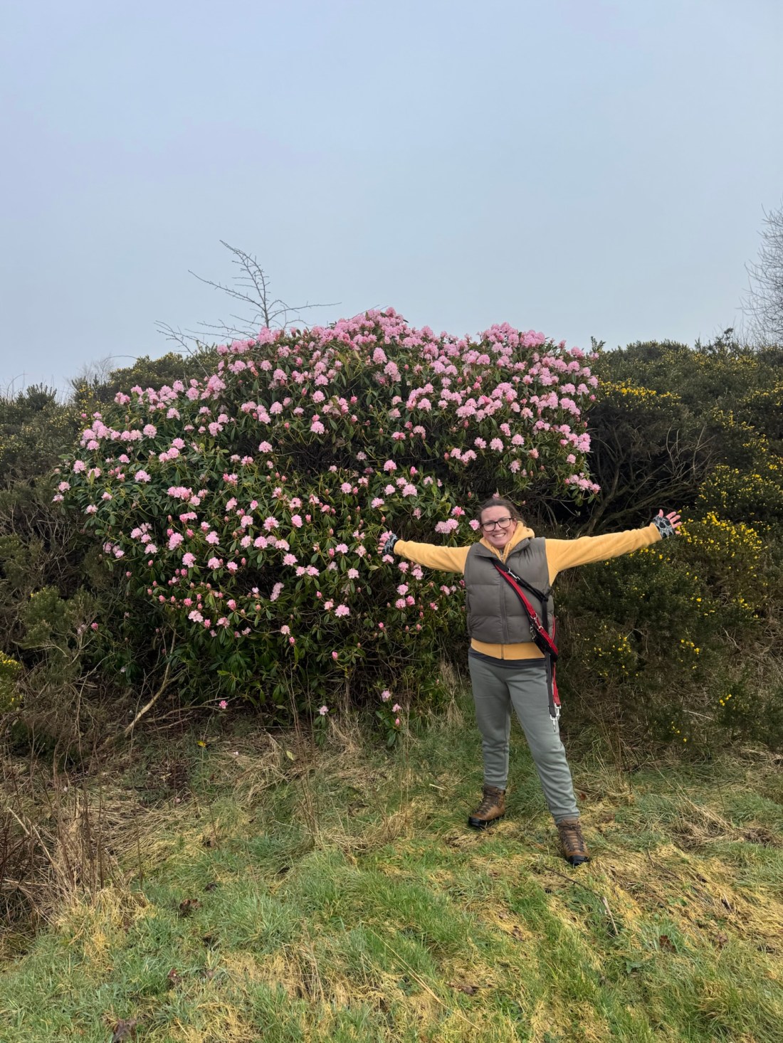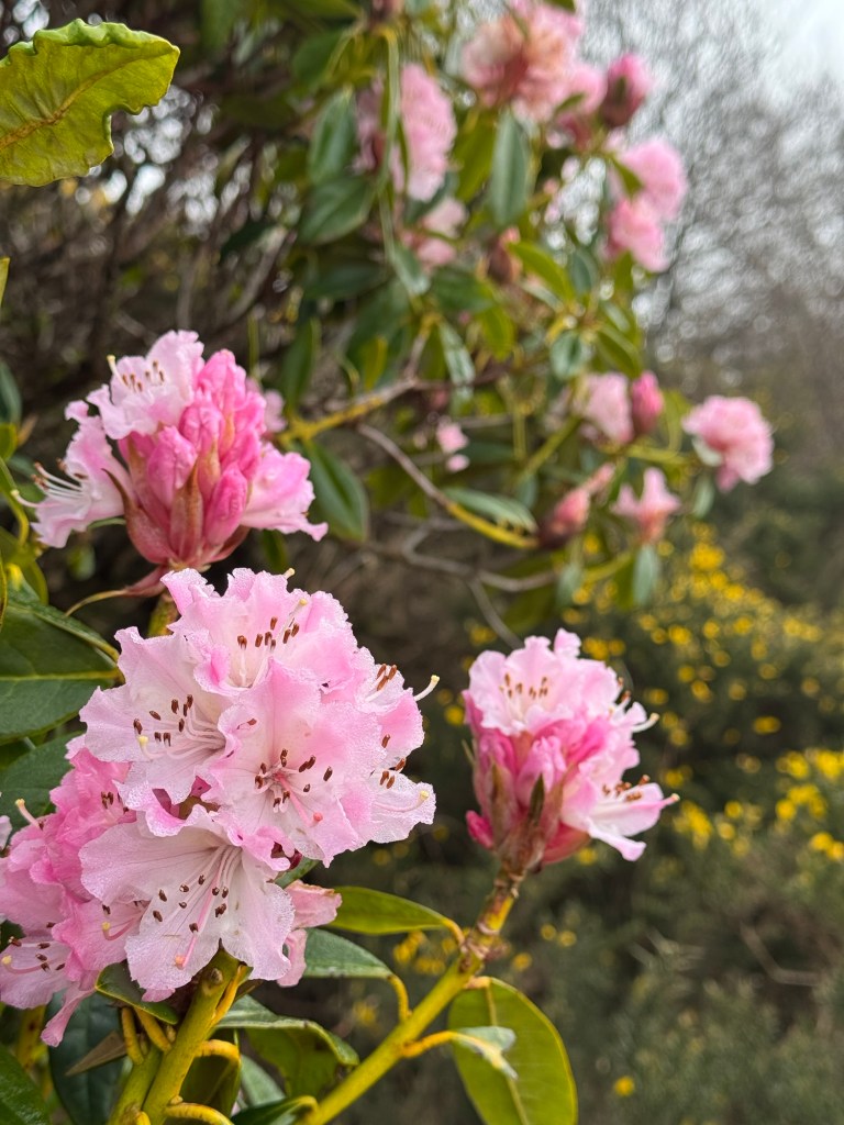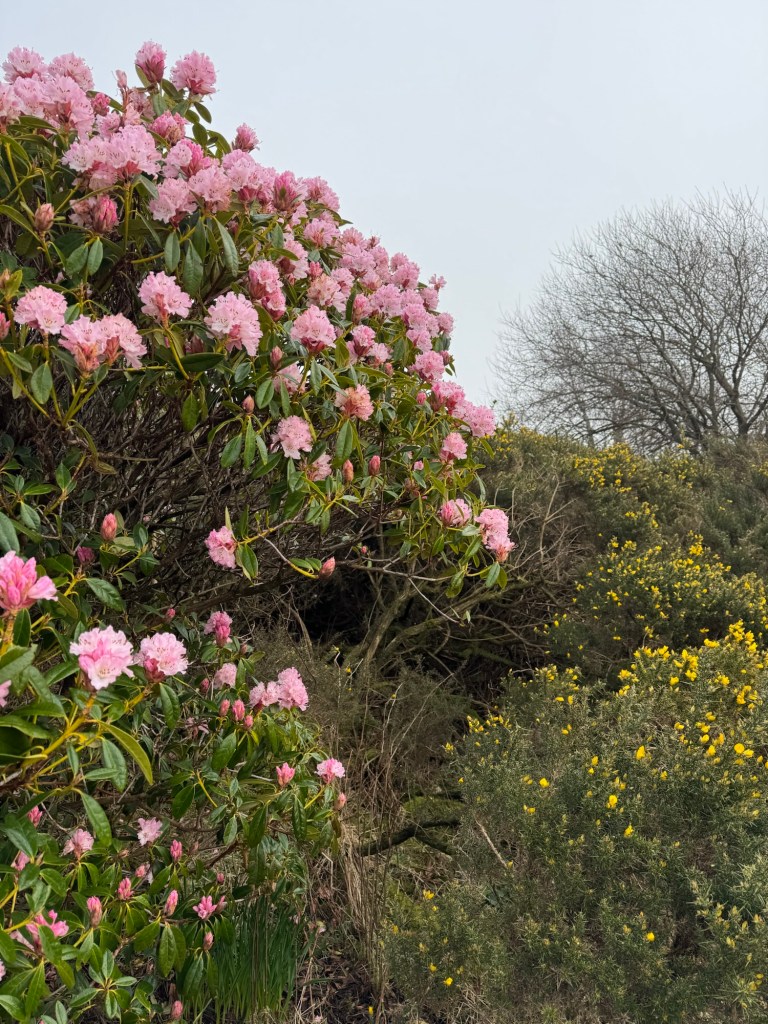 For about two weeks of the year, this beautiful Rhododendron bush flowers a beautiful pink in a sea of yellow gorse and browny/green grass.