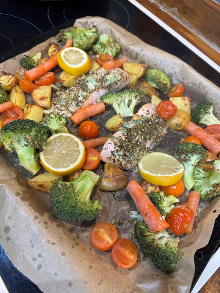 I have a lovely Salmon Tray Bake on the go for dinner. From Healthy Living James.