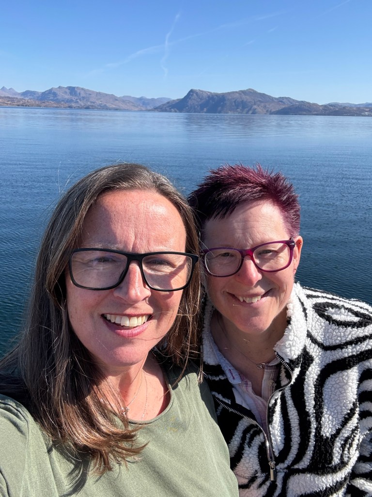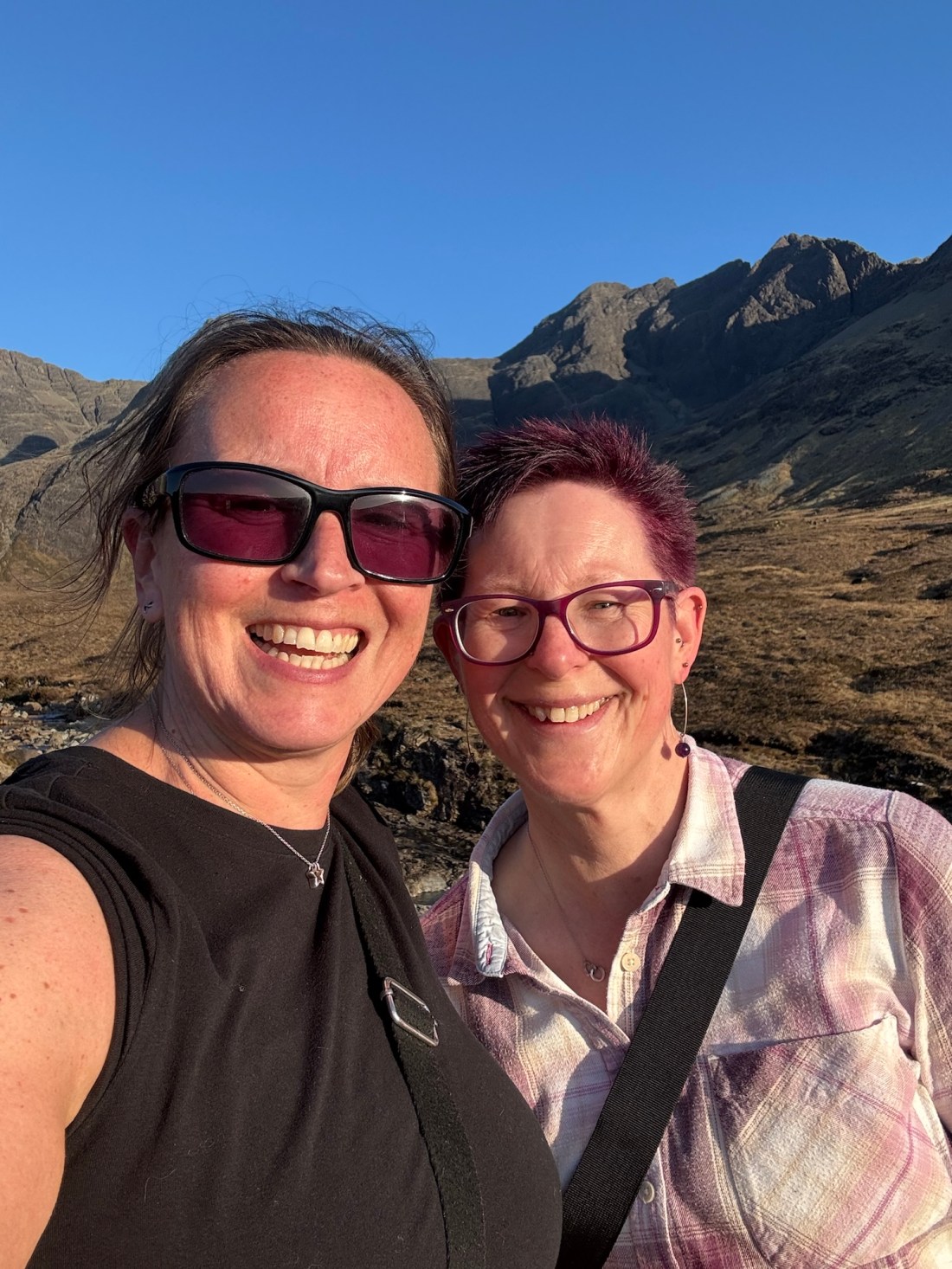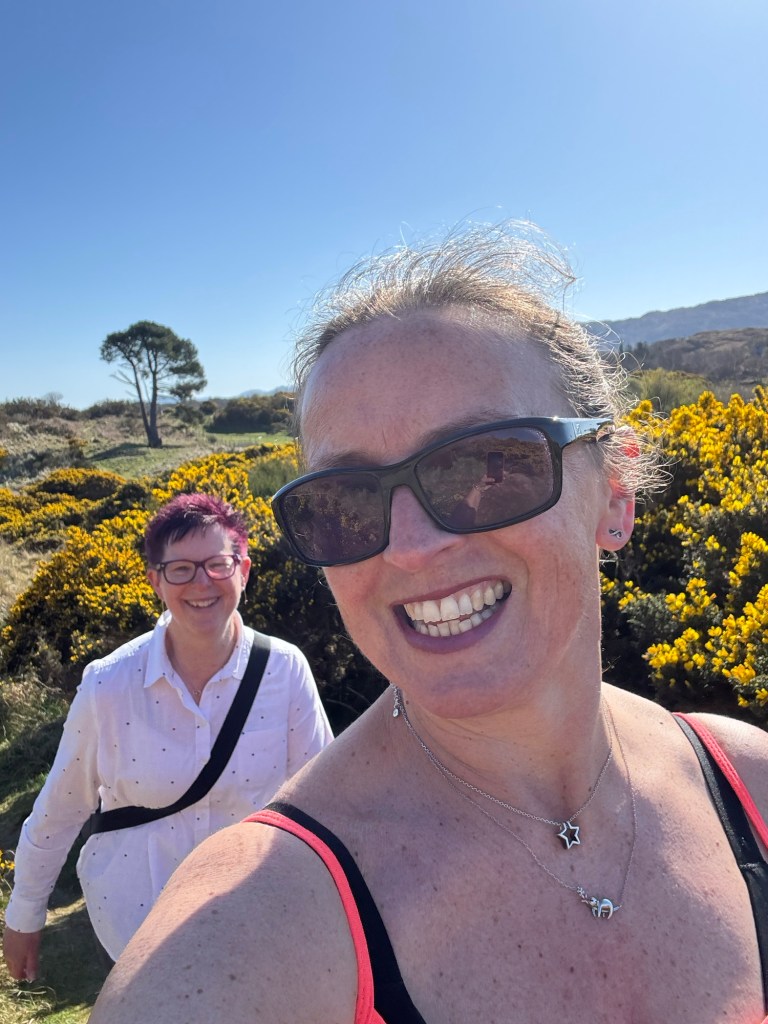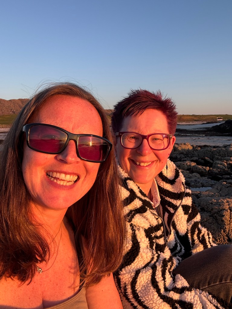 It’s 8pm and I am wearing a vest top in the west of Scotland! Helen who is Scottish, has lived in Devon for 24 years, is wrapped up in a cosy hoodie!