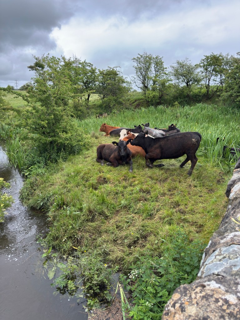 These cows were all cuddled up next to the burn. There are 8 or 9 of them!
