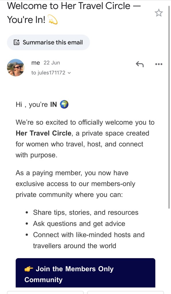 So if you’re reading this and you’ve subscribed to Her Travel Circle, please check your junk email as many subscribers haven’t found the Circle Community.