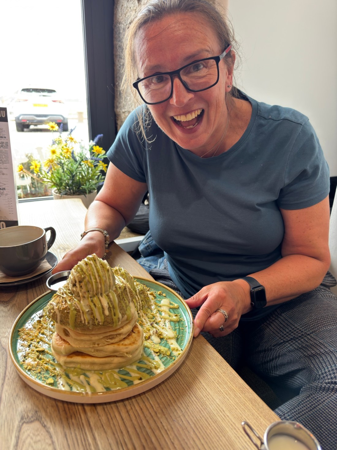 White chocolate pancakes with pistachio ice cream!!! We should have shared one. Far too much for one person 😆