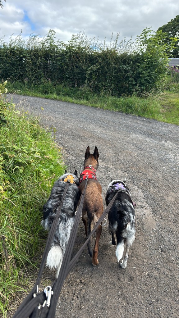 Back home and straight out with Bhruic, Khaleesi and Freya⦠leaving invalid pup, Calaidh, at home in her cone.