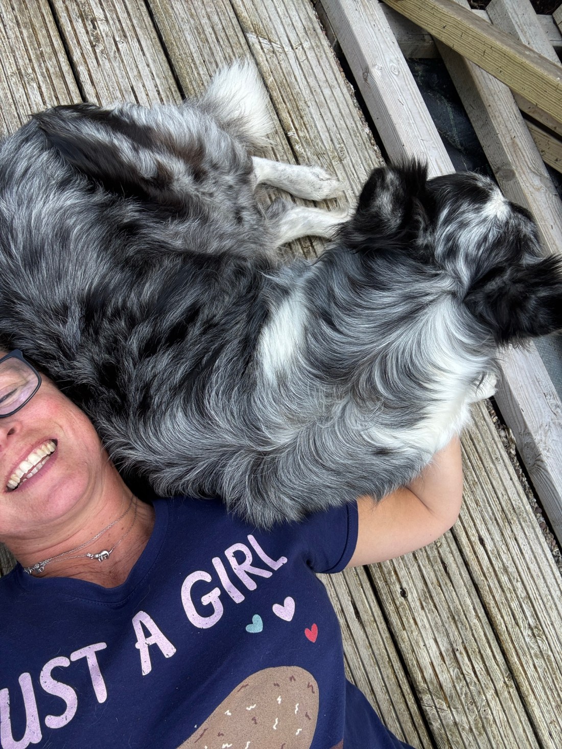 The sun came out and I lay down flat on our decking and stretched my aching body for about an hour while I listened to my audio book. The flat wooden surface really helped. Of course I got cuddled and licked!!!