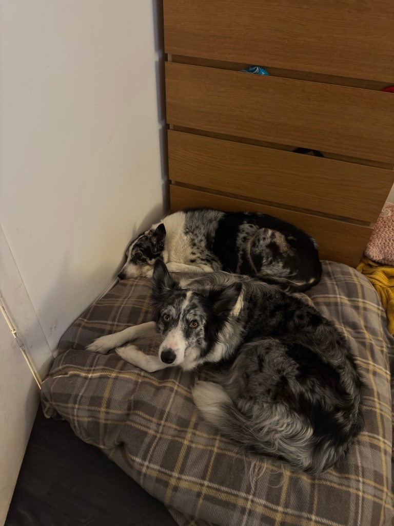 When I put the dogs to bed Freya and Bhru were on the same bed!!