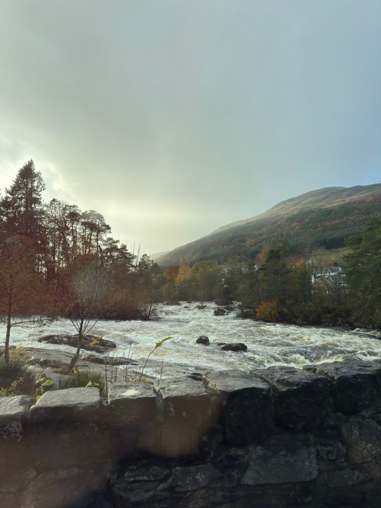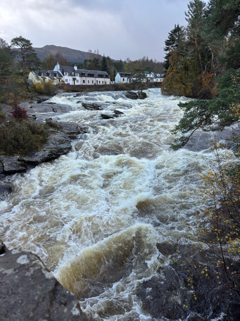 Our first glimpse of the Falls of Dochart in Killin, taken from the car. they are amazing after all the rain. More pics after the girls finish the Ultra.