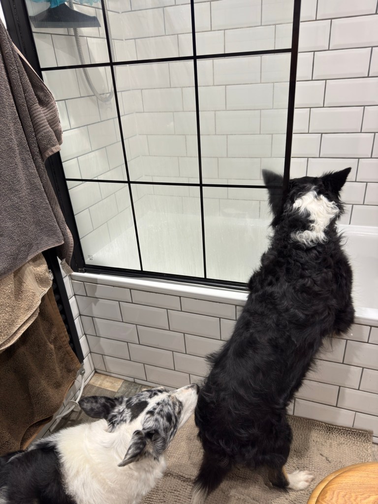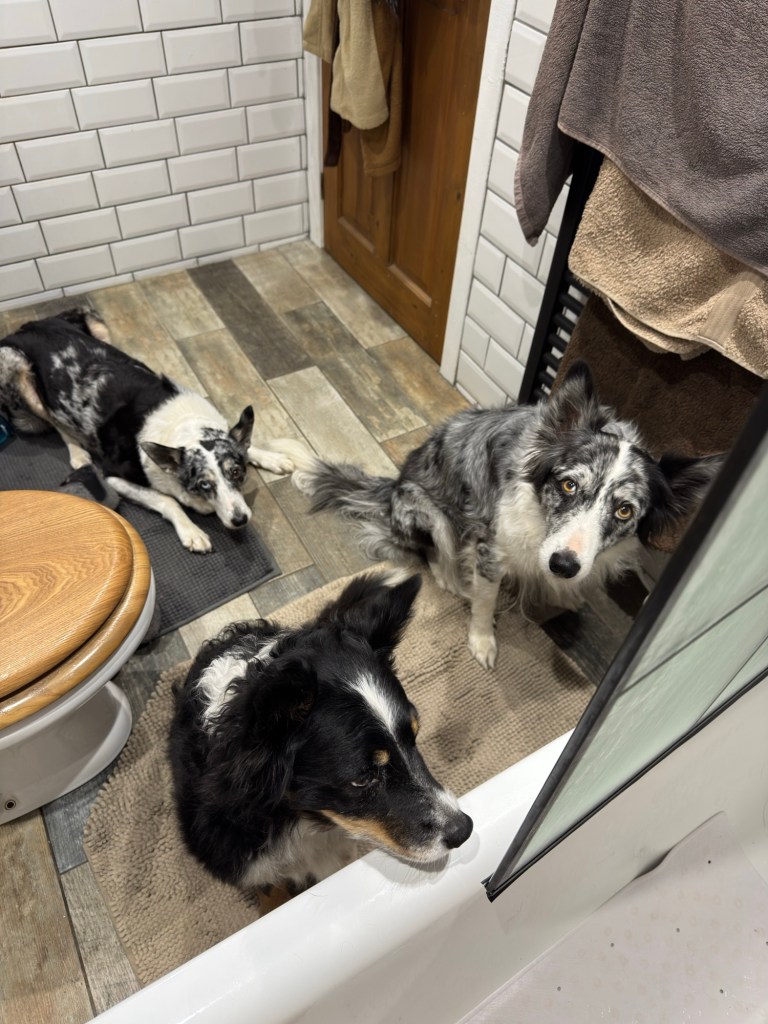 Calaidh and Bhru are staring at the shower, willing me to spray them… which of course, I will not…. I would soak my lovely bathroom 🫣😆