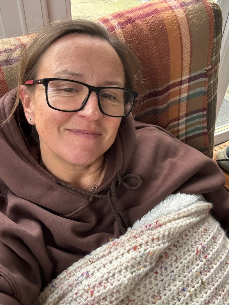 I’m sitting under Craig’s blanket. I’ve had a shower and washed my hair but I’m tired.