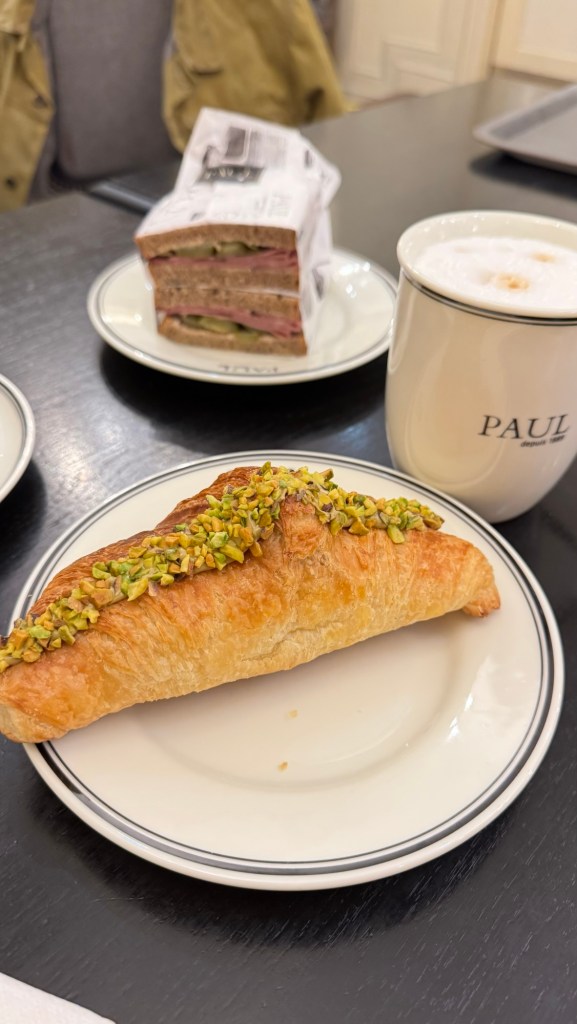 We went to Paul for breakfast. I had the most amazing pistachio cream croissant and oat milk latte.