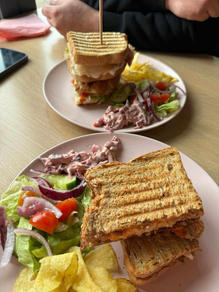 He had a chicken and bacon club toastie and I had veggie haggis with cheese and siracha.